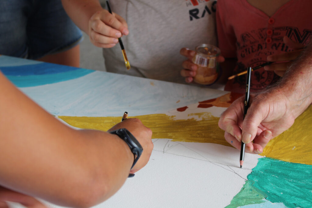 L’œuvre en question se trouve en salle Beauregard de l’établissement (1er étage). Il s’agit de venir coller des petits timbres de couleurs sur les espaces blancs (statuts, pigeon et de créer une fleuriste), en tenant compte des mouvements. Pour cela, il est nécessaire de suivre les traits noirs. Tout le matériel est à disposition (colle, pinceaux, timbres…) Le collage offre un espace de méditation, ouvert à tous. Nous avons 3 semaines pour terminer cette œuvre, donc toutes les personnes motivées sont les bienvenues pour contribuer à son rayonnement.